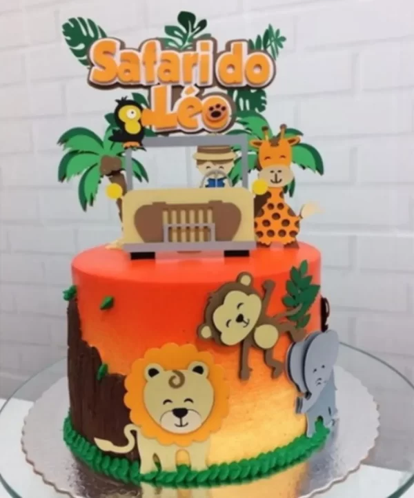 Com esse topo de bolo, sua festa se transforma em um cenário encantador da selva, com girafa, leão, elefante e outros animais fofos em tons suaves e artísticos.